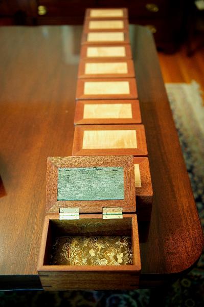 The boxes would all be identical on the outside, mahogany with the center of the top being a