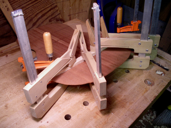 but flexible piece of spruce as a caul on the outside. This also of course helps protect the surface