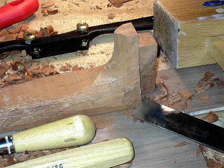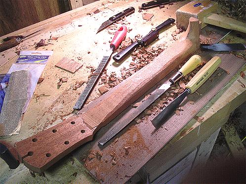 process of shaping the neck. This I did with, as you can see, rasp, file, carving gouge,