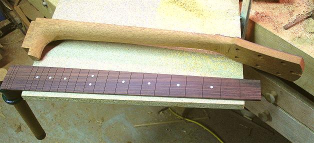 joint and taking out a couple of flat spots on the bottom. Here also is my completed fretboard, which