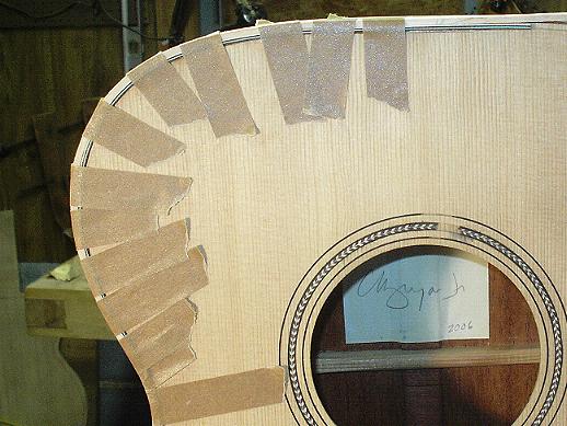 Two final additions to the bracing can be seen: a wide thin spruce brace between the neck block and