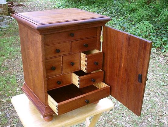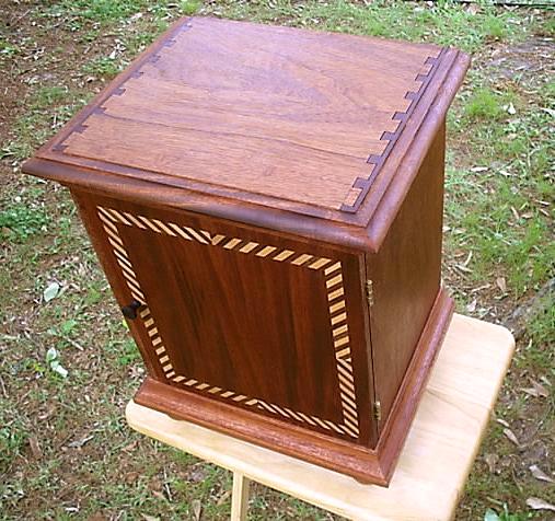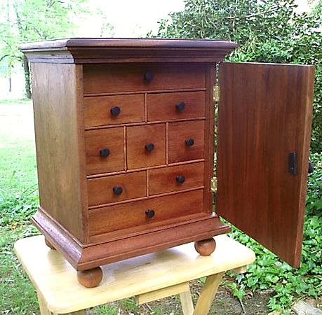 with ebony knobs and a maple/walnut inlay on the door. Drawer sides and
